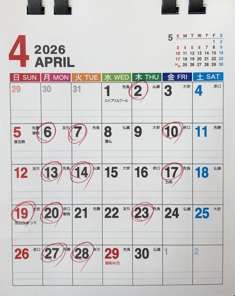 4月のお休みのお知らせ